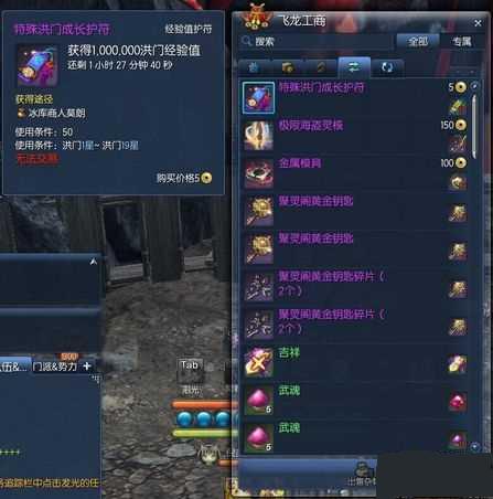 在24日圣诞版本更新之后玩家可以从“飞龙工商”中的交换列表中,使用10张十万经验的洪门经验成长符加5J兑换一张100w经验的成长符。