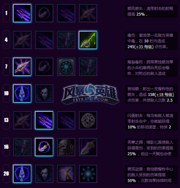 这是目前比较主流的一套加点,四级加毒是为了加强收割能力,毕竟前期伤害不高的情况下,有一个伤害稍微高点的技能挺重要的,七级为了加强推线能力,二十级的时候,如果队友输出比较不足的情况可以考虑加三,加强一下输出。