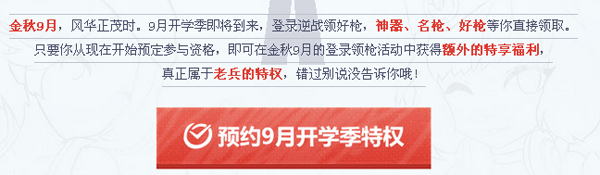 只要你从现在开始预定参与资格,即可在金秋9月的登录领枪活动中获得额外的特享福利,真正属于老兵的特权,错过别说没告诉你哦!
