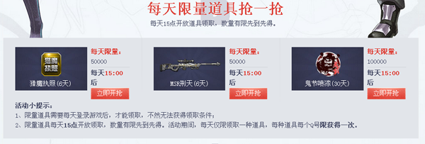 2、限量道具每天15点开放领取,数量有限先到先得。活动期间,每天仅限领取一种道具,每种道具每个Q号限获得一次。