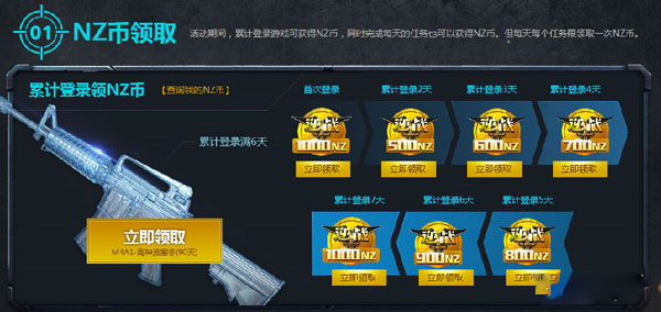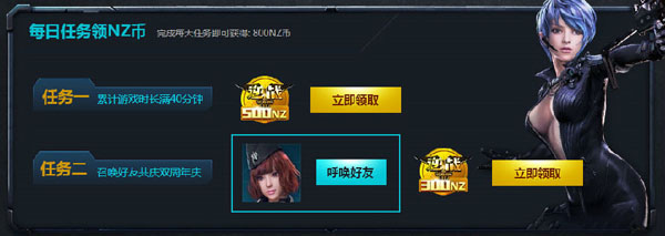 活动期间,累计登录游戏可获得NZ币,同时完成每天的任务也可以获得NZ币。但每天每个任务限领取一次NZ币。