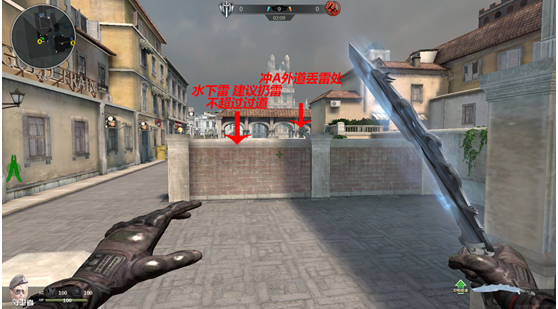 首先当玩家到达A包点的时候就有2条路线的选择,一个是从水下冲往匪徒家,一个是从上面的过道去匪徒家,相应的丢雷的位置也会有所区别,至于这里的雷当然是闪光啦!为何不丢手雷因为炸中人的概率虽有但是炸死的概率就低了,相反闪光的效果就很不错,可以将对方想要速冲的人员视野封住,阻碍其速冲意图,拖延其就位时间。