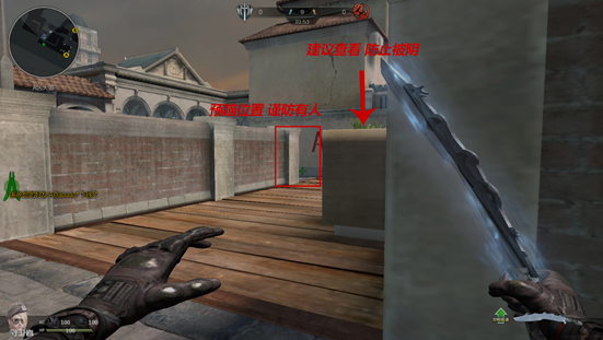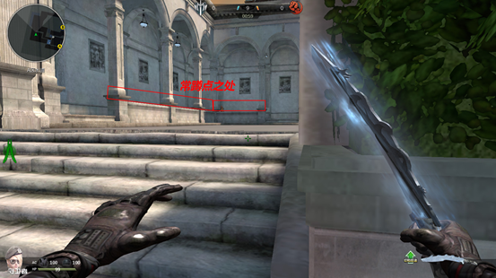 当玩家选择投过道闪从上路冲的时候就需要注意了,到达转角的时候枪口一定要对着对面转角的位置,因为有一定几率对方会在此处卡点。如果你的出生位偏靠后而导致冲到这个位置不是第一时间的话那么就需要注意一下旁边花坛后是否阴着一个人,毕竟这个花坛有一定的宽度,躲在后面的人会被很好的遮挡住,导致自己的视线观察不到。