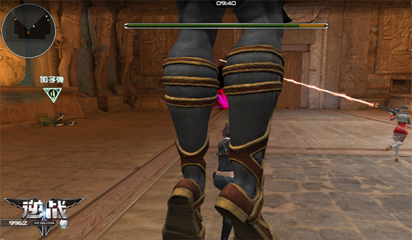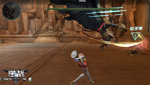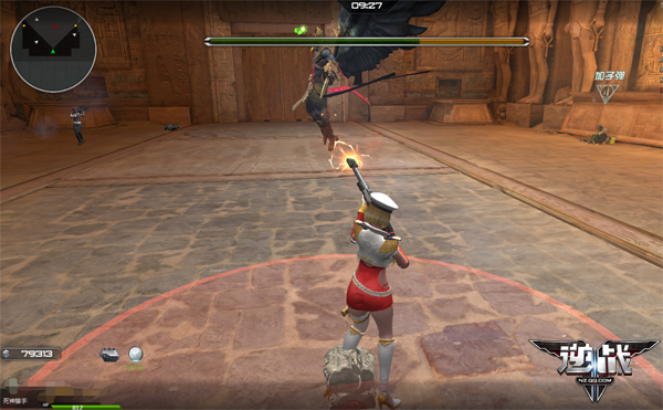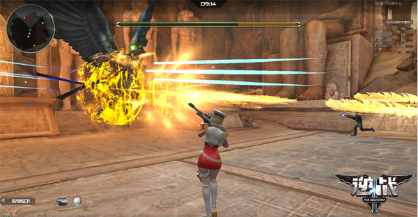 2.第二个招数是发射黄金羽箭,这一招范围有点大,呈扇形发射,如果被扫到会被秒杀!不过在放这一招之前,boss是没有移动的,所以boss没有移动时,玩家可稍微离它近一点,然后注意它的发射区域,那么基本就能躲过了。