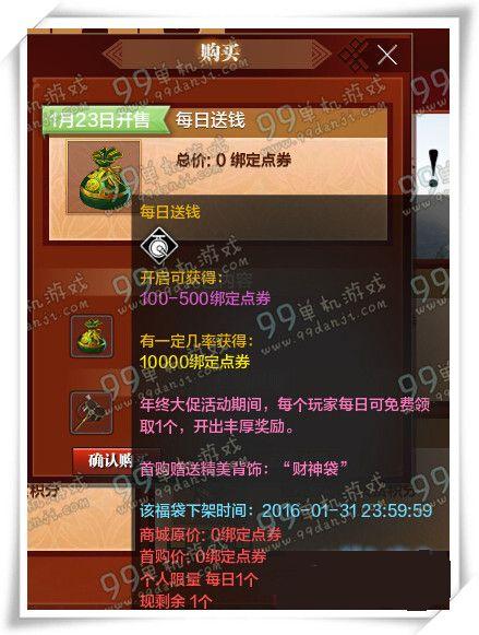 每日送钱开启可以获得100-500绑定点券。有一定几率可以获得10000绑定点券哈。还能开出财神袋的背饰。