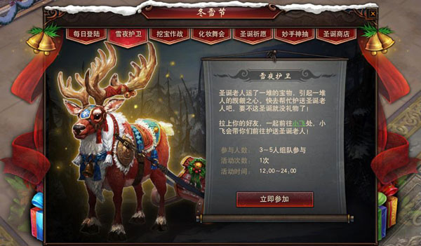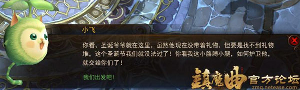 进入活动场景之后,玩家需要跟随着圣诞老人,帮助圣诞老人解决各种问题,并能获得奖励。会随机出现怪物,玩家需击败怪物,圣诞老人才会继续前进。
