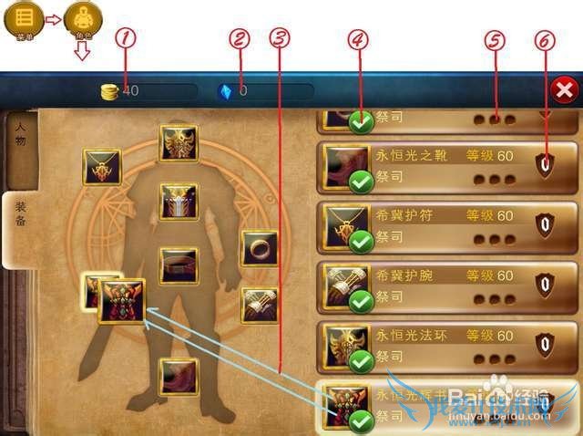 1):金币 2):钻石 3):拖动可替换装备,点击可查看装备详细信息 4):标识当前已经穿戴的装备 5):已经镶嵌的宝石 6):强化等级