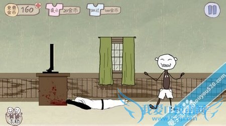这关中,玩家要先点击小贱男的眼睛,让他闭上眼睛,然后在疯狂的摇晃手机,将贞子摔死,最后就可以轻松过关啦!