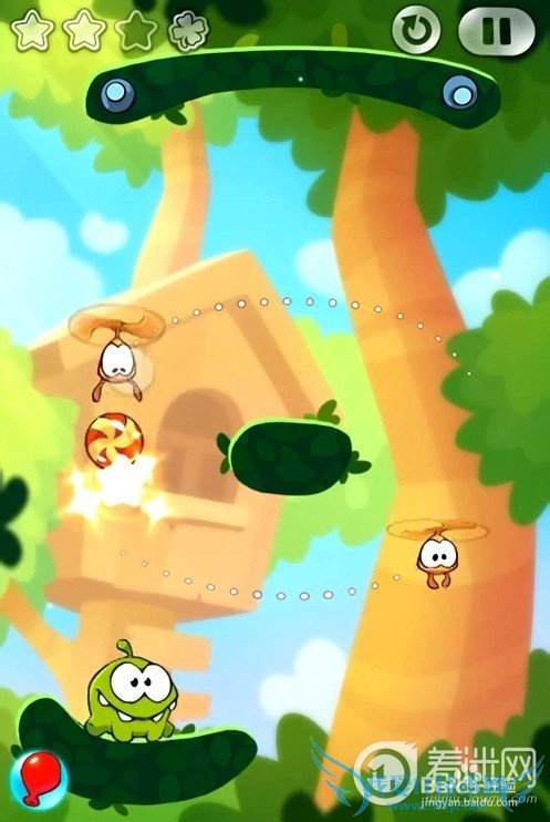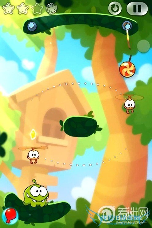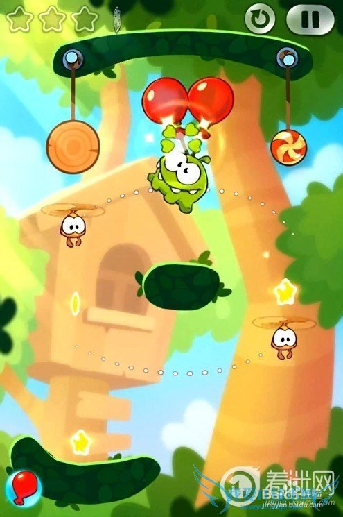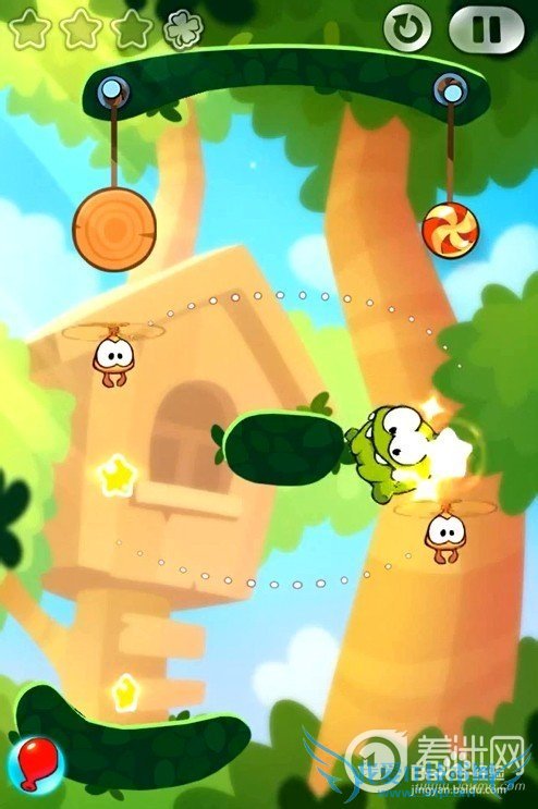 2、 等气球飞到极限的时候同时割断两个气球的绳子,这一小怪兽就会掉到右边小飞虫手上。
