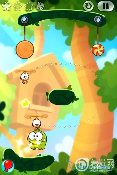 4、 接下来的先把木桩的绳子割断,让小飞虫带着木桩飞到右边再把木桩丢弃,这样小飞虫才能接到即将掉下来的糖果,最后只要抓好时机让小飞虫把糖果丢下就行啦!