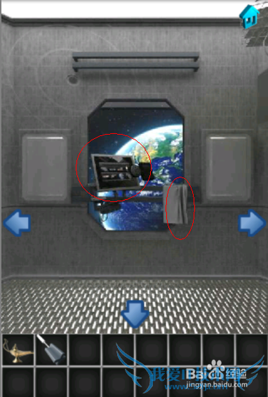 画面再转,窗外能看到地球呢。这里有没有线索?有块布?拿走!电脑?密码??密码是什么??957?不对,上面是图画。。再找。