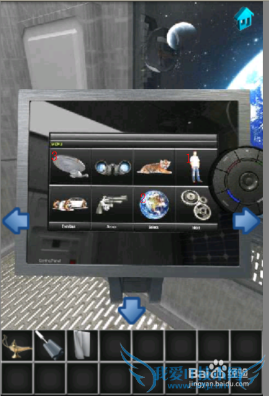 转啊转的,来到有3个方块的地方,找找看有没有线索。瞎点瞎点的,发现上面的方块有点不一样了。这是什么?人?地球?外星物???有点印象,这些东西哪里见过?刚刚的电脑!!!