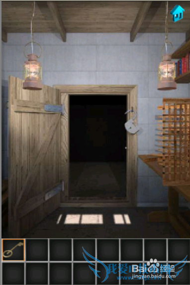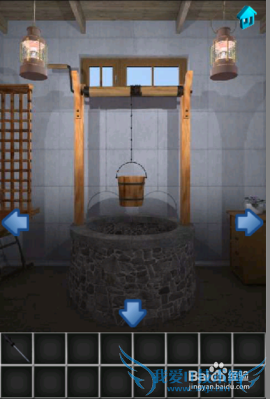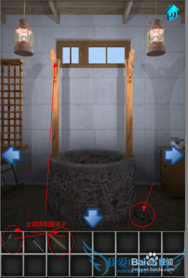 得到的物品H(一个木头)再和剩下的摇手合并,得到的物品放在井架子上。然后点井旁边的绳子,再去转动井上边的摇架,多点几次,直到水桶打上来,然后点水桶拿到钥匙。开门。如下图
