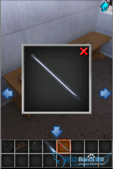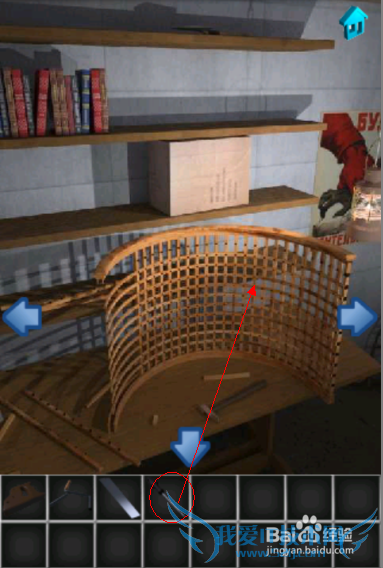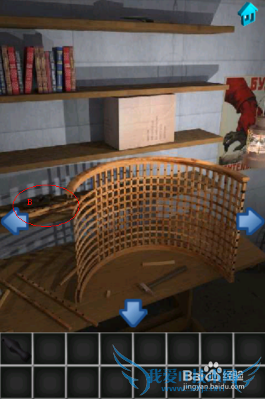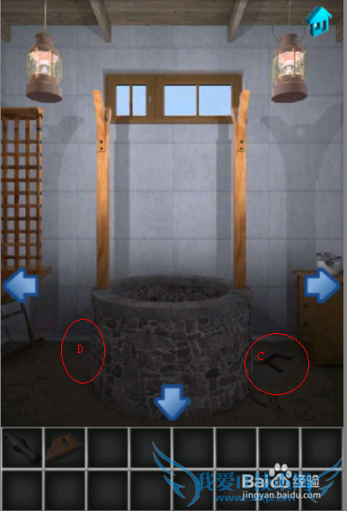 开始在门把手上拿到物品A。放书的桌子上拿到物品B。来到井边,在右边拿到物品C.左边点进去放大拿到物品D。再转到2张画的画面桌子上点它放大拿到物品E。如下图