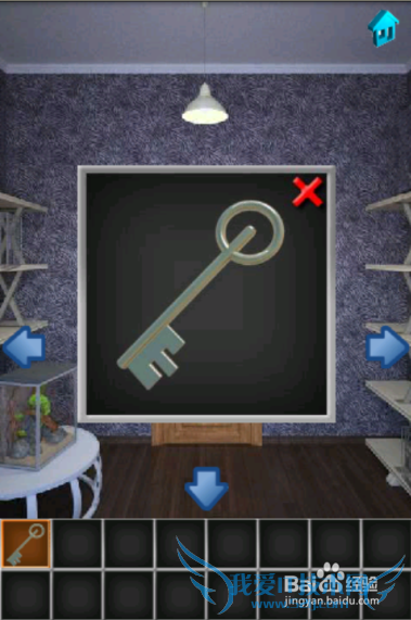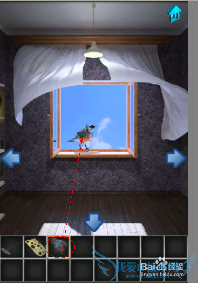 来到窗子这里,在窗台上放点鸟食,等小鸟出来以后,把纱网套在它身上,拿到一把钥匙,再来到墙面这里,用大锤把墙砸开,从里面拿出一个装了巴哥的笼子,用钥匙打开笼子,拿到巴哥!