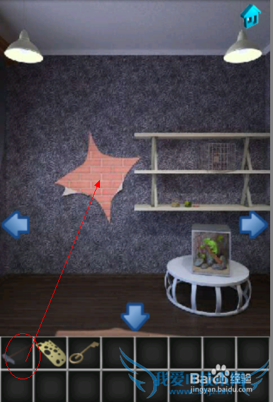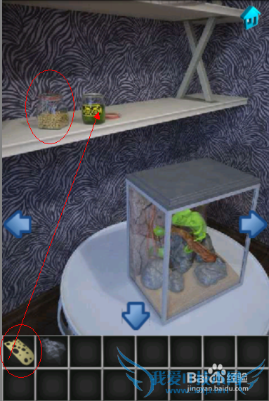 哇,进门就看到一只蜥蜴趴在门上,想办法把它弄走。画面右转一下,很多铁笼,点一点,拿到把铁锤,点台子上,拿到一片乳酪。来到窗子的地方,地上有什么?一个纱网。捡起来。来到墙纸破出墙砖的地方,点一下台子,拿到一些鸟食,顺便把乳酪沾点“酱”