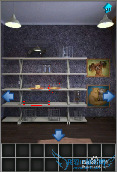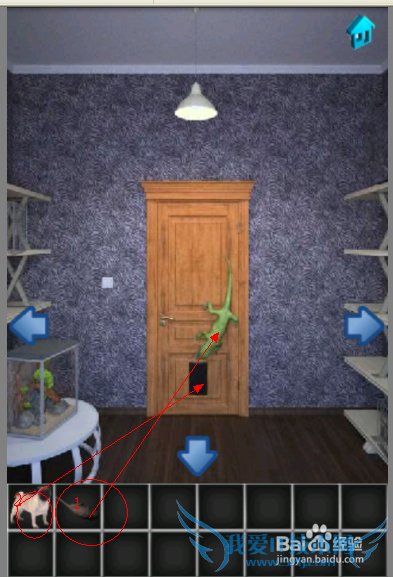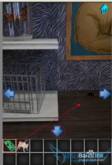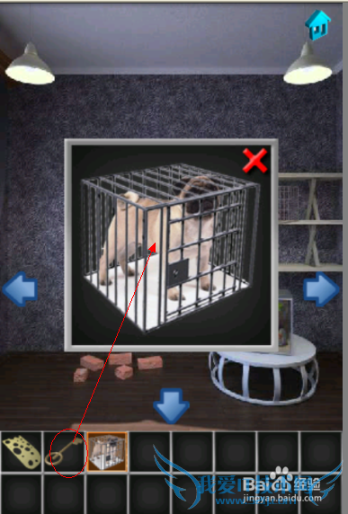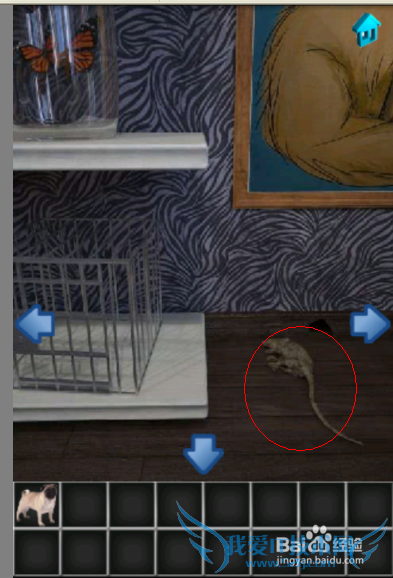 接着再转回放满笼子的画面,右下角放大,把沾了“酱”的奶酪上上去,离开一会,再进去,拿到死耗子!!!把死耗子喂给门上的蜥蜴吃。满足了蜥蜴以后,把狗放进狗洞里面去,拿到钥匙。开门!