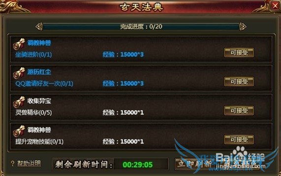 玩家角色达到38级可以在任务栏直接点击玄天法典打开,玄天任务分为白、绿、蓝、紫、橙五个不同颜色的品阶,品阶越高完成后获得的奖励越多。玄天任务每30分钟刷新一次,也可以消耗10量银子刷新一次,如果需要大量经验的朋友可以消耗10元宝直接刷出一个橙色任务。每日最多能完成20次玄天任务,每日凌晨0点重置任务次数。