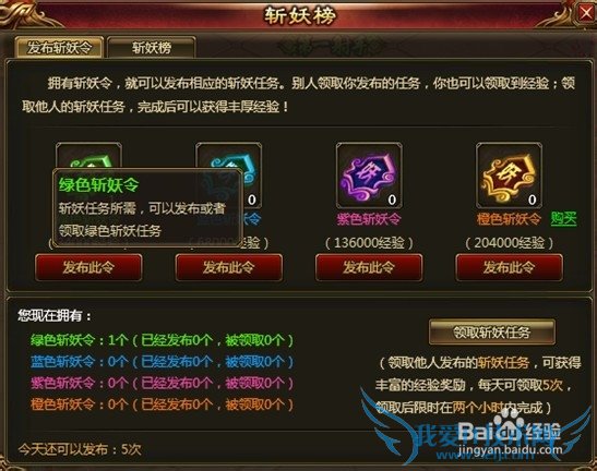 斩妖任务可以在天水城【斩妖天君】处领取,每天可以完成5次和发布5次天道令的机会。完成天道令任务或者是自己发布的天道令任务被其他玩家领取都可以获得丰厚的经验奖励。天道令品质分为:绿、蓝、紫、橙,对应品质越高的任务完成或被接去获得的经验奖励就越多。