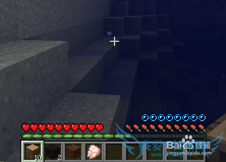 杀鸡除生肉还会有几率掉落羽毛,杀牛除生肉还会有几率掉落皮革,但猪就只有肉了==Lz运气不好,杀鸡没掉落羽毛。可以看到经验条到了一半多,就是吸收经验球的结果。饥饿也缺少了(我还是很节省跳跃的啊)。如果饥饿没了的话会扣血的哦~还有一点必须纠正,落入水中不会S,而是会在饥饿条上出现一排氧气条。只有当氧气条全部不见的时候才会受到不多的溺水伤害。并且有一个很重要的地方,如果看到一个洞穴千万不要进去,对小白是致命的,这点我以后会讲。(诶,刚才还找到了的啊==咋不见了……算了洞穴就不配图了==)
