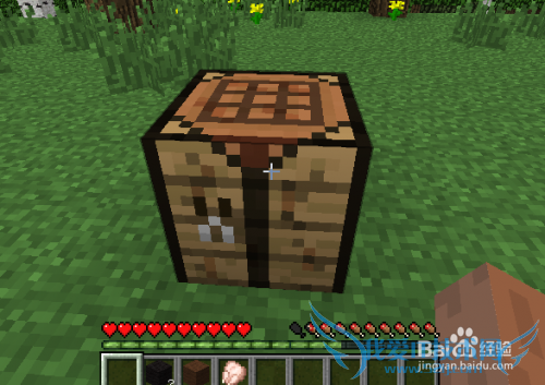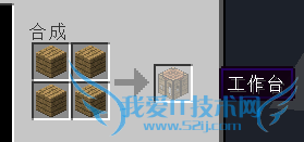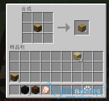 闲话不多说,现在估计下午也过了一半了,资源也收集得差不多了,好啦,正式开工!首先,按下E打开物品栏,单击拿起刚刚的10块木头,右键放1块到“合成”栏上的任意位置,然后拿起右边的4块木板,一个位置放一个,就有了一个工作台啦^_^工作台是MC的第一步,也是基础。 牢记!