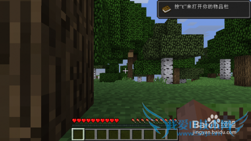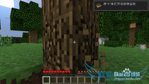 好了,再熟悉一下基本操作:wasd负责移动,空格跳跃,打多了CF、CS这种游戏的人不陌生吧!双击w键可以跑步,饥饿值消耗很快的==……鼠标左键按住不放会破坏方块,右键是安放方块或使用物品(基本是左键不行就右键,呵呵)。 熟悉得差不多(最好快点,不然……),就让我们开始吧! 看到周围一大片一大片的树了吗?MC里有句话:要致富,先砍树!这点你们以后会了解的。总之,把你的十字标对准树,按住左键开始砍!