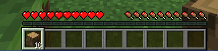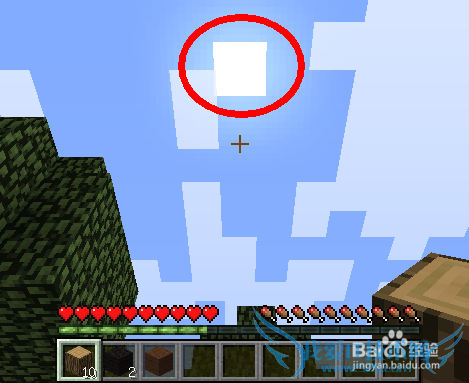 生存第一天:我们先来熟悉一下界面: 最上面的一排10个红心是你的生命值,如果没了就会挂,这点我不用解释吧。生命条右边的是你的饥饿条。跳跃和奔跑及游泳等都会消耗,饥饿值大于等于9的情况下会以5秒半颗心的速度恢复生命值。再下面的一排灰的条条是经验槽,满后会升级,这点我最不用解释了再再下面的9个格子是快捷栏,可以用大键盘的数字键1-9选中,鼠标滚轮也行。