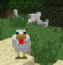 然后,你还要先杀一只猪(或牛、鸡),这些都非常容易认出来。(下图就是一群鸡,还有一只羊)鸡很脆弱,4下就挂了,但是牛和猪还是要8下。总之杀掉1~2只就停手,除非你的时间很充裕