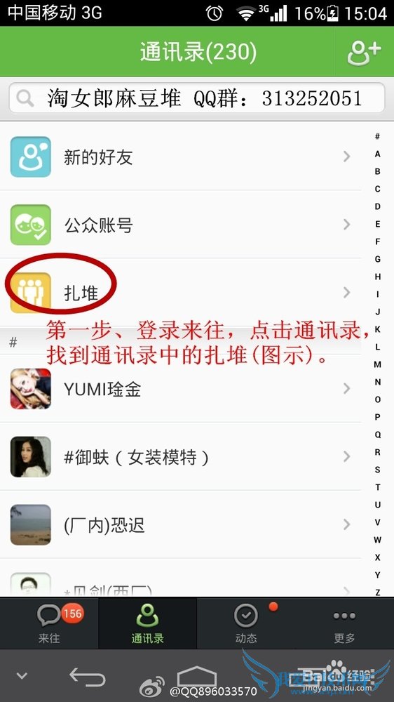 第一步、登录来往,点击通讯录,找到通讯录中的扎堆(图一);