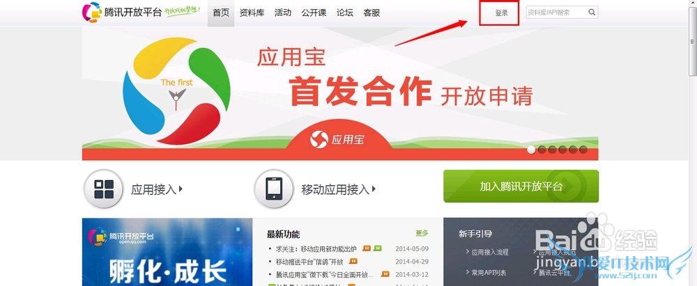 打开腾讯开放平台之后,我们会进入他的首页,不要心急,先点开右上角的登陆,这个登陆是需要用QQ号来登陆的哦,不过想必大家一定是都有的,如果没有的话,先去申请一个。