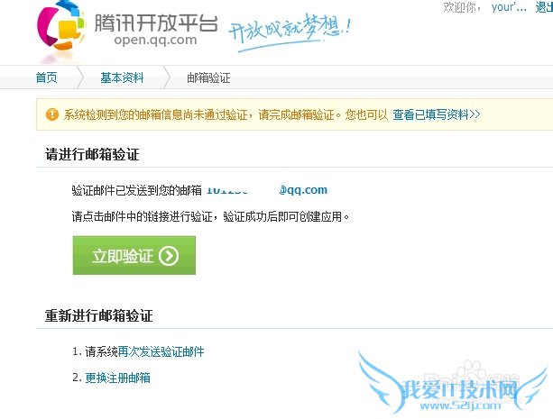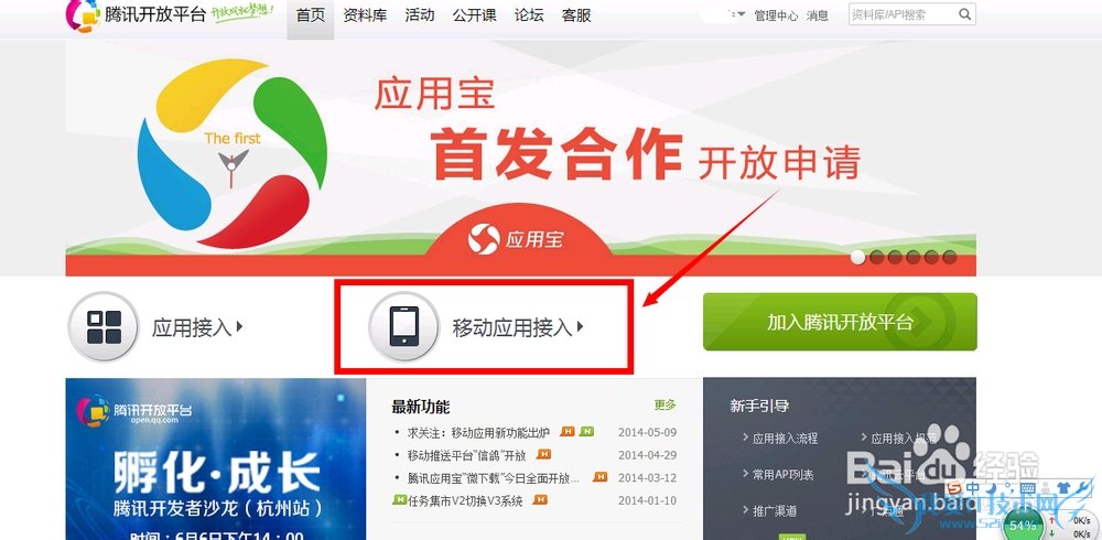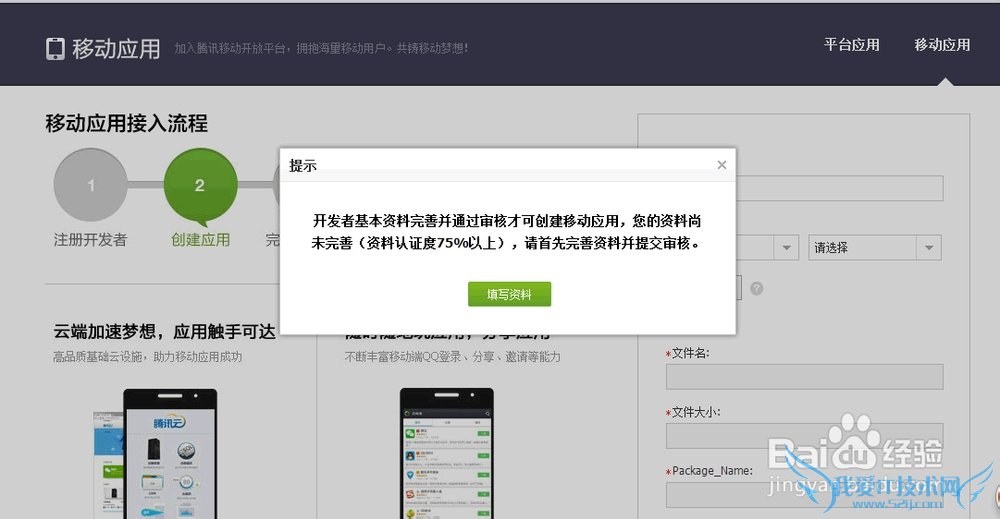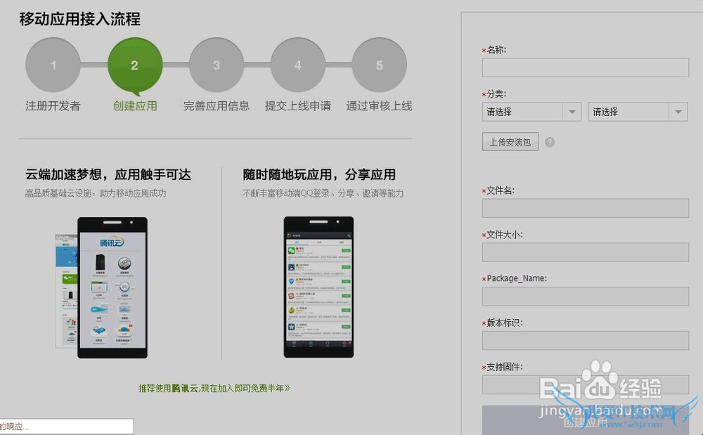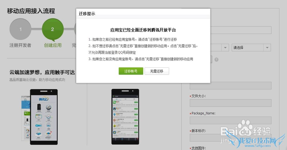 进入邮箱给的地址之后,我们会看到界面让我们选择创建平台应用或者创建移动应用,同样是根据自己所做的应用而选择,完成之后,会出现一个迁移提示,如果之前有应用宝账号,就选择迁移账号,没有的话就无需迁移。