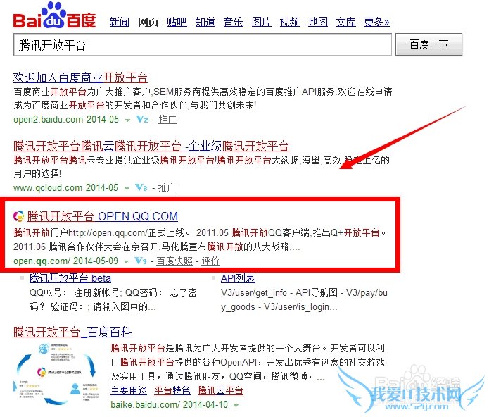 首先,我们需要进入腾讯开放平台,打开浏览器,输入腾讯开放平台,找到连接并点开,如下图所示,不要进错了哦。