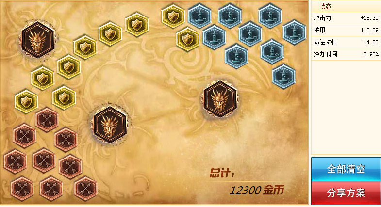 红色:固定攻击力*9 黄色:固定护甲*9 蓝色:固定魔抗*3+固定减CD*6