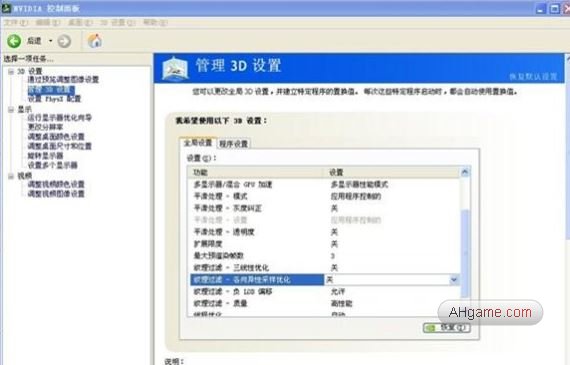 3D设置,质量调为高性能,其它所有开着的都点“关”。