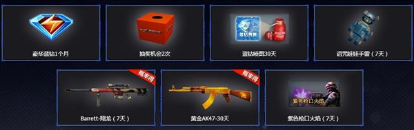 点击任性开启,支付15QB即可获得专属大礼(豪华蓝钻1月 抽奖机会2次 蓝钻喷图30天 诅咒娃娃手雷7天 紫色枪口火焰7天),并有概率获得黄金AK或者Barrett翔龙哟!