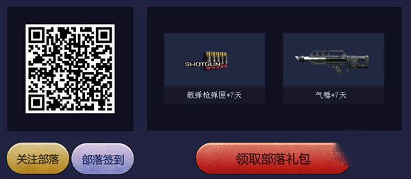 活动期间关注CF部落并签到即可领取部落礼包1份,单Q限1次。
