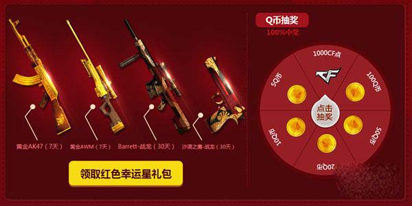 红色幸运星:黄金AK47(7天)黄金AWM(7天)Barrett-战龙(30天)沙漠之鹰-战龙(30天)