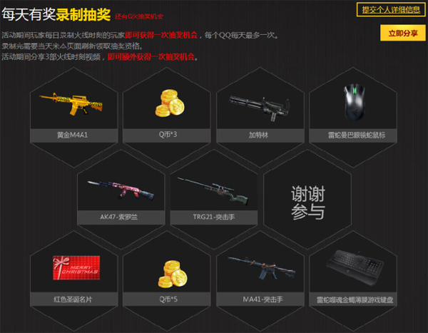 活动期间玩家每日录制火线时刻的玩家即可获得一次抽奖机会,每个QQ每天最多一次。