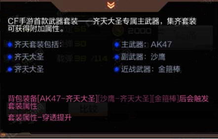 解析:该套装需要集齐主武器:AK47-齐天大圣、沙鹰-齐天大圣以及金箍棒后就会触发该套装效果,效果为穿透力的提升,AK47系列的穿透能力向来较强,这一次的套装效果还提升了穿透力,我们可想而知,AK47-齐天大圣的穿透力是有多么的恐怖了!