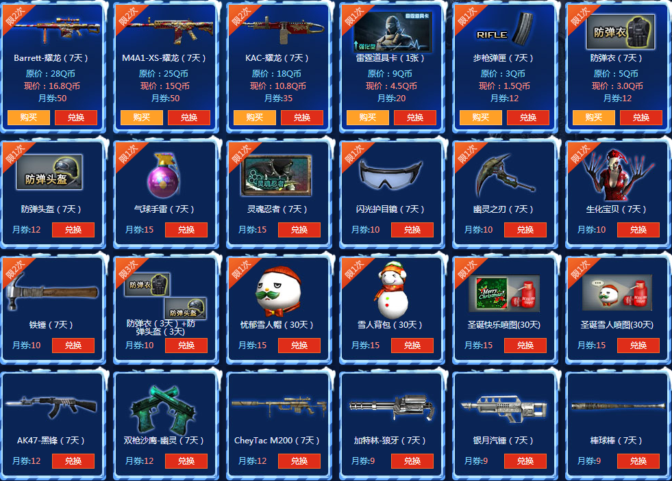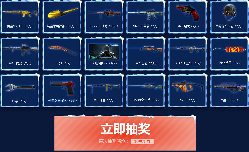 cf12月军火基地签到活动,每日签到领取1兑换券,首次签到可以领取10兑换券。活动可以兑换cf耀龙系列武器、防弹衣和幻影道具卡等角色道具,除此之外还能参与抽奖活动。