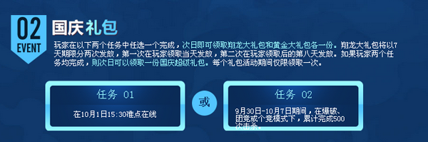 玩家在以下两个任务中任选一个完成,次日即可领取翔龙大礼包和黄金大礼包各一份。翔龙大礼包将以7天期限分两次发放,第一次在玩家领取当天发放,第二次在玩家领取后的第八天发放。如果玩家两个任务均完成,则次日可以领取一份国庆超级礼包。每个礼包活动期间仅限领取一次。