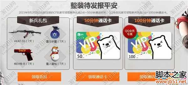 1.2015年9月20日以后新注册的CF玩家可领取新兵礼包1份+50分钟通话时长,QQ会员玩家可领取新兵礼包一份+100分钟通话卡。