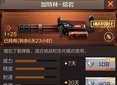 那么首先我来简单的介绍下加特林-熔岩吧,加特林-熔岩属于钻石枪,价格较为亲民,属性上是加特林系列中最为强势的。涂装了熔岩涂装,提升了载弹量、换弹速度以及便携性。载弹量提升到了175发每个弹匣,让原本子弹就多的加特林更上一层楼。而换弹速度的提升让玩家在对抗生化僵尸的时候,使得火力间隙变短,防止僵尸的反扑。可以说这一把加特林-熔岩绝对是生化的专属武器啊。