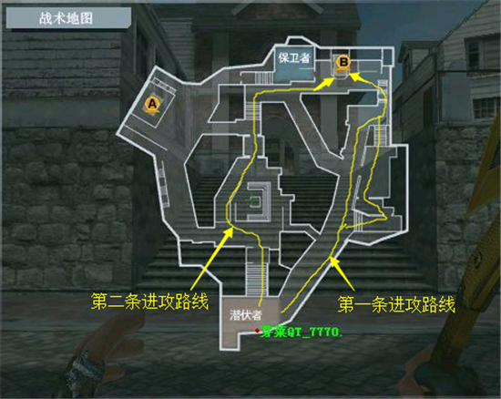A道的进攻,要靠楼梯下走,利用通道内箱子,走S路线突进。不要贪枪。楼梯的方向注意搜索小白房的卡点位。