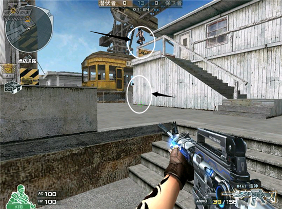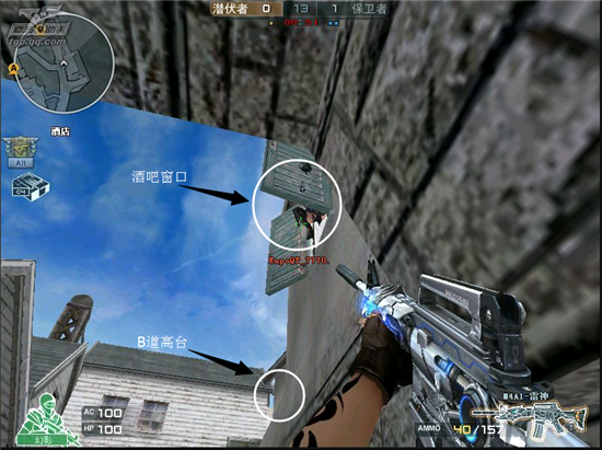 那么我们就来说桥下的进攻,B桥下,通道长,被保卫发现几率很高,所以,进攻酒吧的队友,就要帮忙弄出一些小动静,让人感觉,你要打酒吧,其实在摸排B道。下图就是一般会卡的位置。
