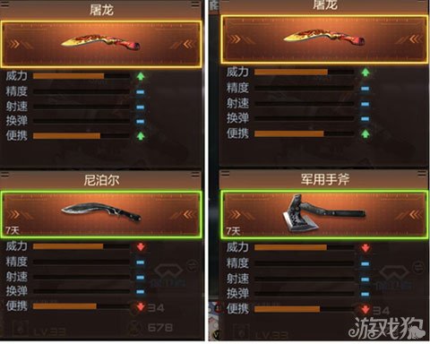 军斧,我们都知道这一把近战武器也算是穿越火线中的明星近战武器,由于其攻击速度快,便携方便而被玩家所熟知。那么它在屠龙面前,又会是什么样子的呢?我们看到屠龙在威力和便携方面要比军斧逊色得多。真不亏是英雄级近战武器,名不虚传,在武器的各方面都得到了提升。