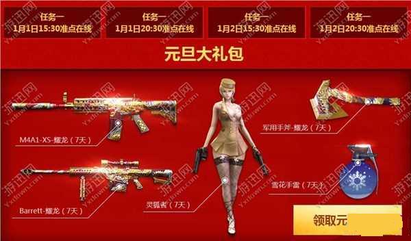 活动期间,玩家完成下列任务中的任意一个,次日即可领取一份元旦大礼包。每个QQ号仅限领取一次。
