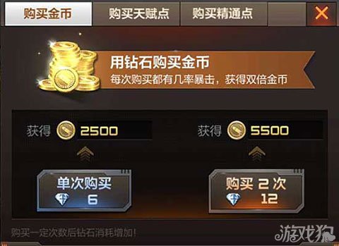 如果真的着急需要大量的金币可以使用这个方法,在游戏中直接用钻石来购买金币。但有一个问题,到底是买单次购买还是购买一次呢?我给各位玩家解释一下,如果只购买的金币量不大那么是单次购买的性价比比较高,但要是金币的需求量大的话,那么选择购买一次是最好的。因为购买一次之后他会显示购买两次,然后一直递增以此类推,而且比单次购买的金币会多一些。比较适合钻石富裕的玩家。所以请玩家考虑再三在下手以免攒了好久的钻石浪费。