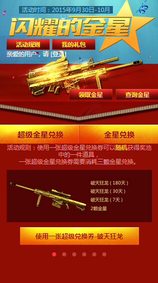 活动简介:玩家每日登录游戏,次日可领取一颗金星,一颗金星可兑换一张金星兑换券,金星兑换券可抽取战龙、AK茉莉等武器,累计获得5张兑换券后,可解锁超级模式,玩家可消耗3颗金星兑换一张金星兑换券,抽取破天狂龙、断离、黄金M4、暗金沙漠之鹰等稀有武器!