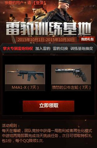 友情提示:凡是使用掌上穿越火线的玩家均可立即领取M4A1-X和愤怒的公牛。只要玩家在爆破、团队竞技模式中胜利一次或在生化模式中游戏两局,,第二天便可加入雷豹训练基地,第一次直接领取雷豹(7天)。加入基地后,每天游戏30分钟便可获得10体力,体力既可用于抽奖,亦可用于兑换黄金M4A1-X,黄金AK等奢华道具,都是三十天的哟~